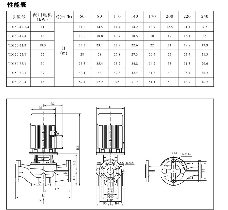 TD150系列單級管道離心泵,配有標準電機和機械密封。此類產品的結構與相近類型產品相比,更不易受到泵送液體中雜質的影響。產品設計為頂部可拉出的拆裝形式,其可以在不影響管路系統的情況下對泵進行維修。所有泵采用創新式便拆式機械密封,更好機械密封無需拆卸電機。